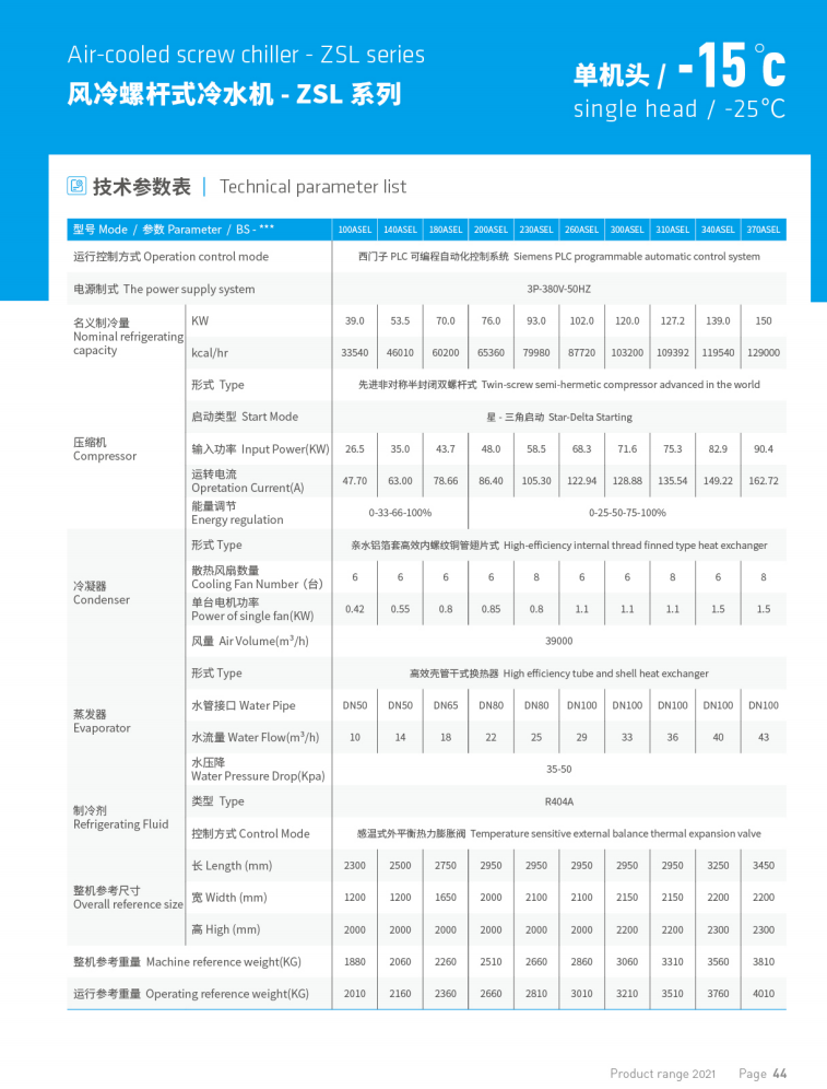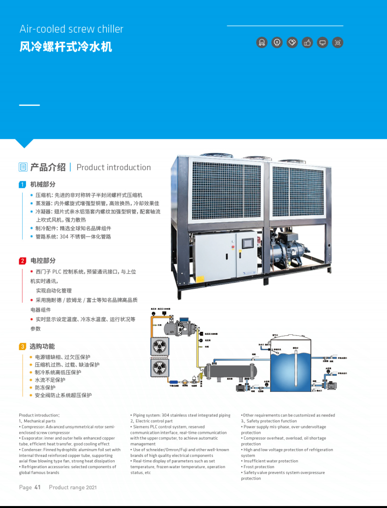 螺桿式冷水機的結構簡單,運行穩定,機組的冷凝,蒸發器全部采用高效率熱傳導管,壓縮機采用高效率的全封閉式渦旋式壓縮機具備結構簡單,體型小重量較輕,安裝方式方便等眾多優勢.系統健全能量自動控制系統,依據負載轉變自調整機組起停狀態,這種方式更為環保節能.運行中計算機自動控制系統會根據設備客戶端,耗熱量轉變來調節機組能量的輸.全智能根據監管檢測的具體負載,與客戶的設置之差快速分辨到所需要的制冷量.操作方便簡單且形象化,機組選用全智能可編程控制器,漢語顯示/數碼管顯示,依照屏上/板上提示菜單欄選擇操作,直接使用手指頭輕按按鍵,就可以運行機組,控制面板可以隨時表明機組的工作狀態,并可以文字表格參數方法表明.